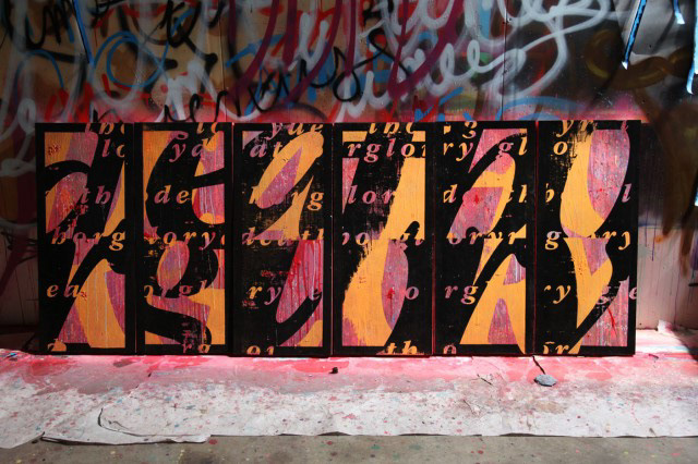 Death or Glory. Each Panel is apx. 17''x42'' mixed media & paint on wood.